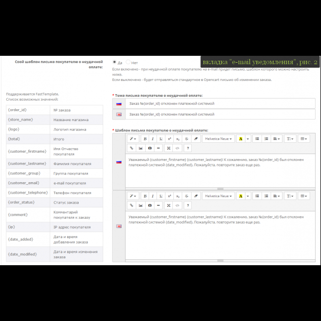 - Управление шаблонами e-mail оповещений о результатах оплаты покупателей и администраторов интернет-магазина;