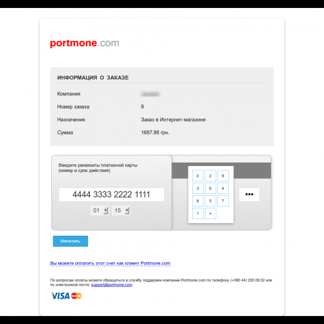 Модуль позволяет оплачивать заказы пластиковой карточкой через платёжный шлюз Portmone.com