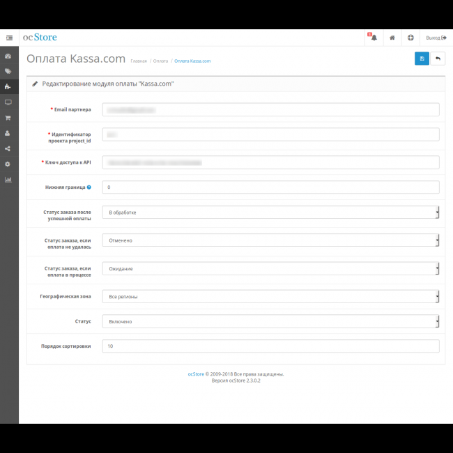 6. В личном кабинете Kassa.com на странице проекта надо узнать projectId (цифра рядом с названием), и указать ссылку на обработчик https://your-site-domain.ru/index.php?route=extension/payment/kassacom/callback