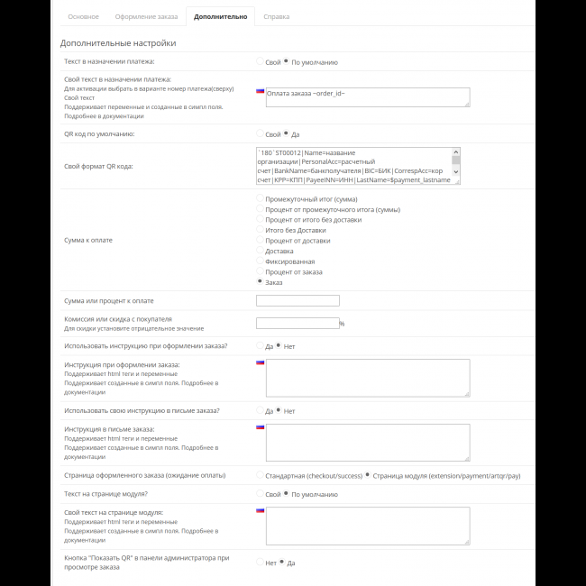 - Возможность использования инструкции к оплате при оформлении заказа (использование переменных таких как «номер заказа», «ссылка на оплату»,