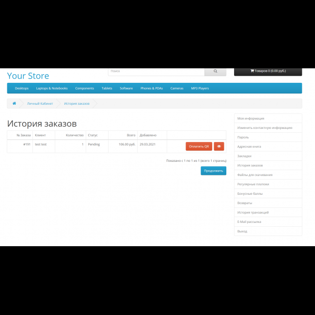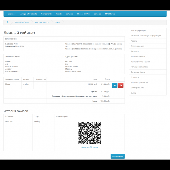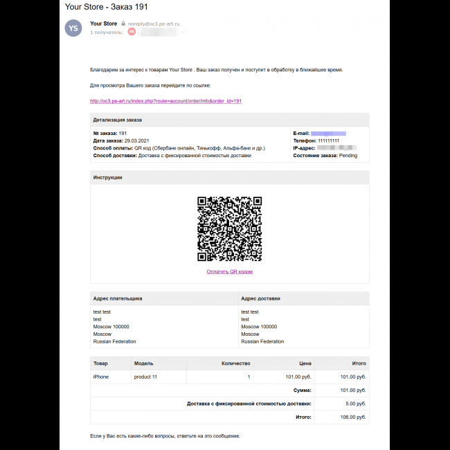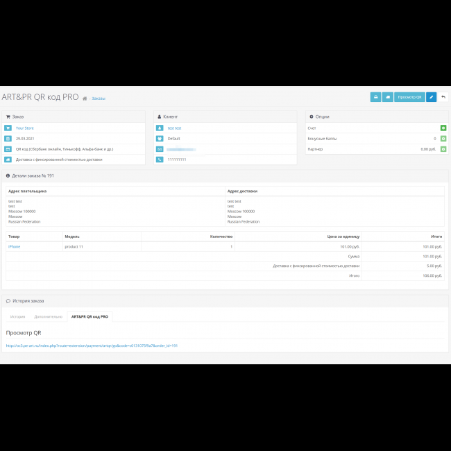 Отображает qr код для оплаты на страницах сайта, в личном кабинете и письме о заказе.