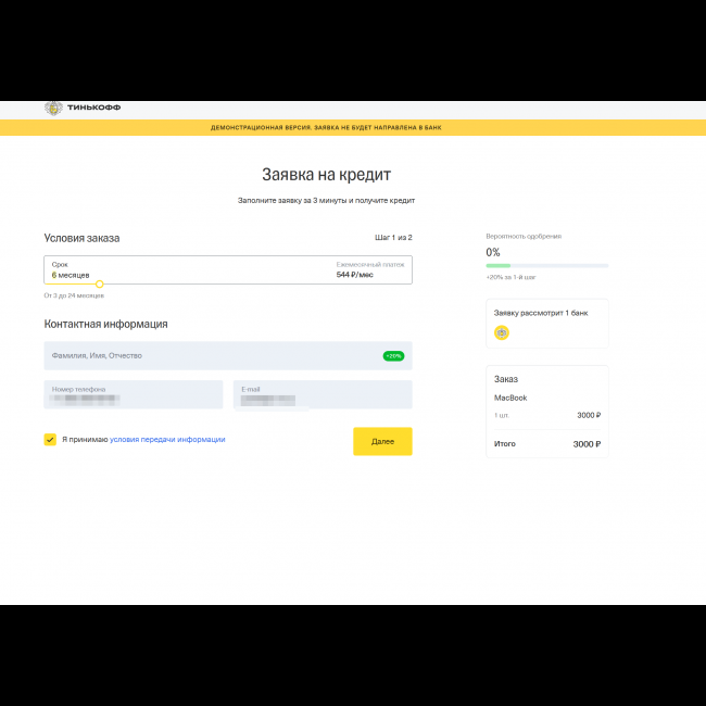 - Поддержка бонусов в оформлении кредита (ценник товаров будет сформирован с учетом всех скидок и наценок)