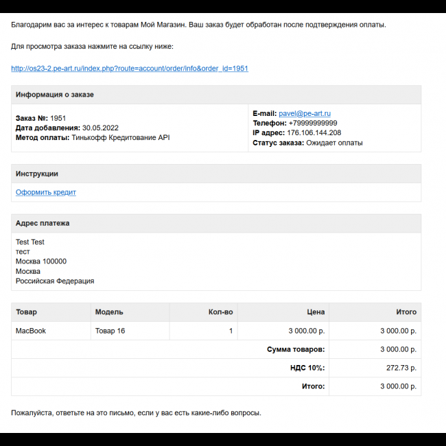 - Возможность использования инструкции к оплате в письме о заказе (использование переменных таких как «номер заказа», «ссылка на оплату»,