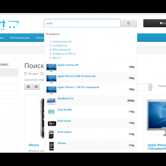 Поиск для интернет-магазинов, использует выдачу в формате JSON и внешне будет выглядеть так, как поиск OpenCart/ocSore 2.х вашего шаблона. Подойдет для любого шаблона.