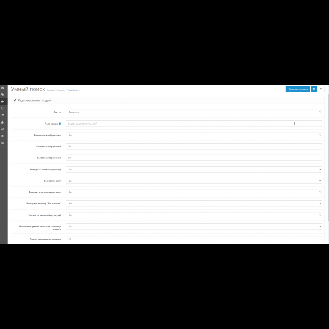 3) Войти в настройки модуля в Дополнения - Модули - Умный поиск , и выставить необходимые настройки. Сохранить.