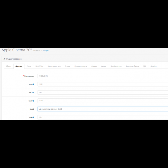 Модификатор добавляет дополнительное поле с названием ean2 в форму редактирования/добавления товара.
