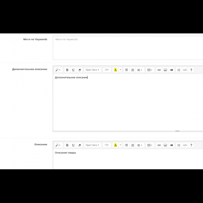 Второй модификатор добавляет поле Дополнительное описание - description2. Сохраняет данные с привязкой к языку и имеет визуальный редактор.