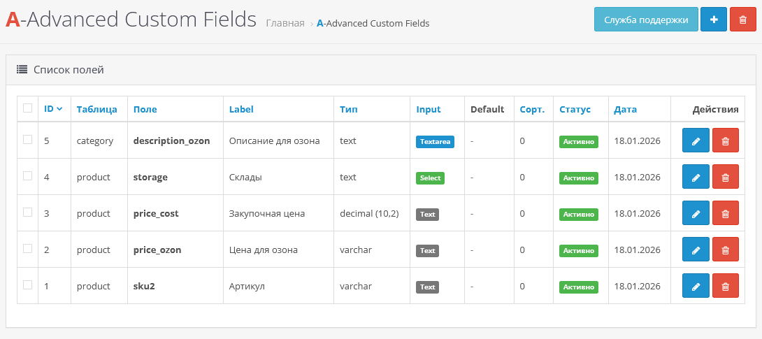 Advanced Custom Fields, добавляются непосредственно в таблицы OpenCart и становятся полноценной частью структуры данных магазина. Благодаря этому они доступны для работы в любых других модулях и расширениях, которые взаимодействуют с данными товаров, категорий и производителей. Дополнительные поля можно редактировать, заполнять, обновлять и использовать в автоматизации, импорте, экспорте и массовых операциях так же, как и стандартные поля системы — без дополнительной интеграции, API или доработки сторонних модулей.