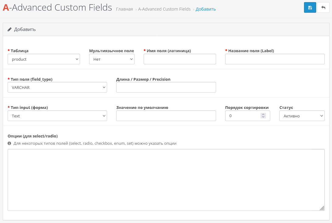 Advanced Custom Fields — это удобный модуль для добавления и управления дополнительными полями у товаров, категорий и производителей в OpenCart