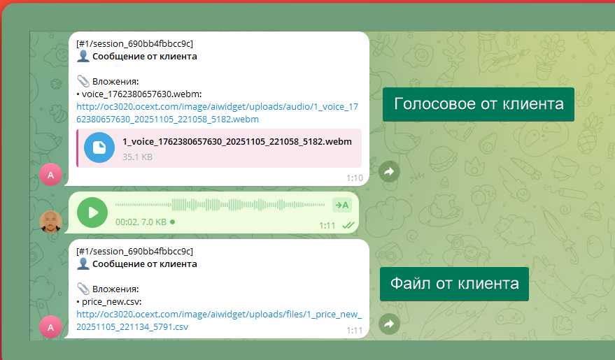 - Загрузка файлов и голосовых сообщений: (виджет ↔ Telegram)