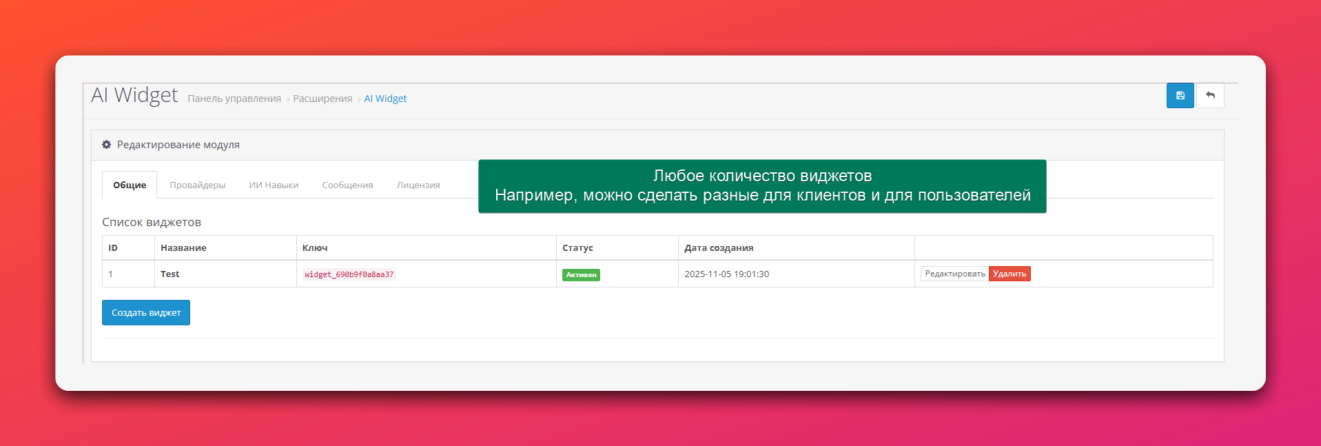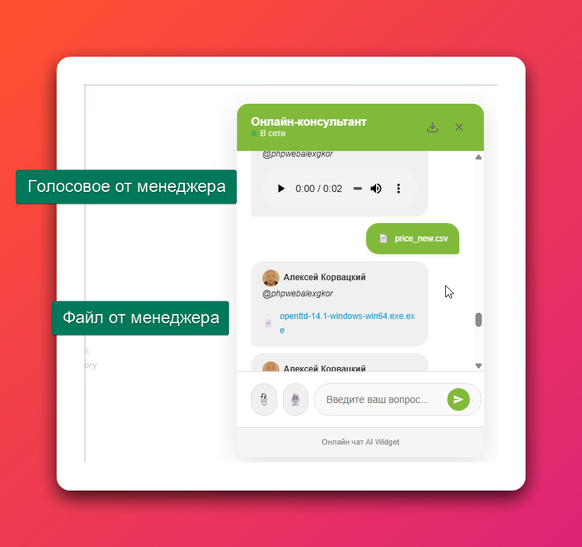 AIWidget — это современный чат‑виджет для сайта с полной интеграцией (всё работает на стороне сайта, полноценный модуль для OpenCart). Он работает, как с ИИ (любым), так и без него, собирает клиентскую информацию, поддерживает двустороннюю связку с Telegram (сообщения, файлы, аудио), позволяет менеджерам отвечать из админ‑панели, передавать файлы и голосовые сообщения, а также аккуратно хранит историю по сессиям.