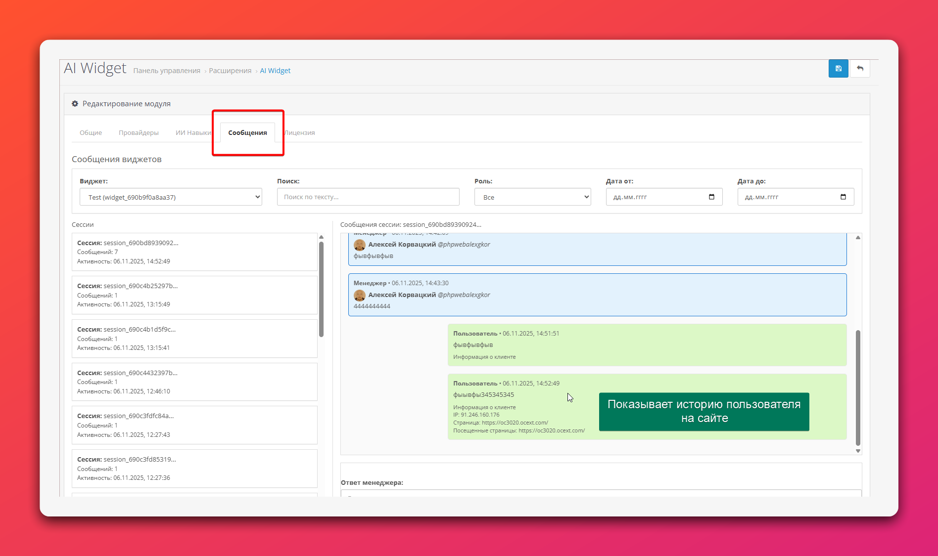 - История, сессии и «Сообщения» в админке: (фильтры, просмотр, ответы)