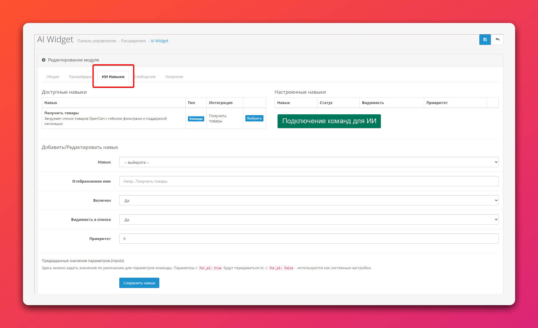 - Готовые команды - capabilities подтягиваются через /capabilities, отображаются как «быстрые команды».