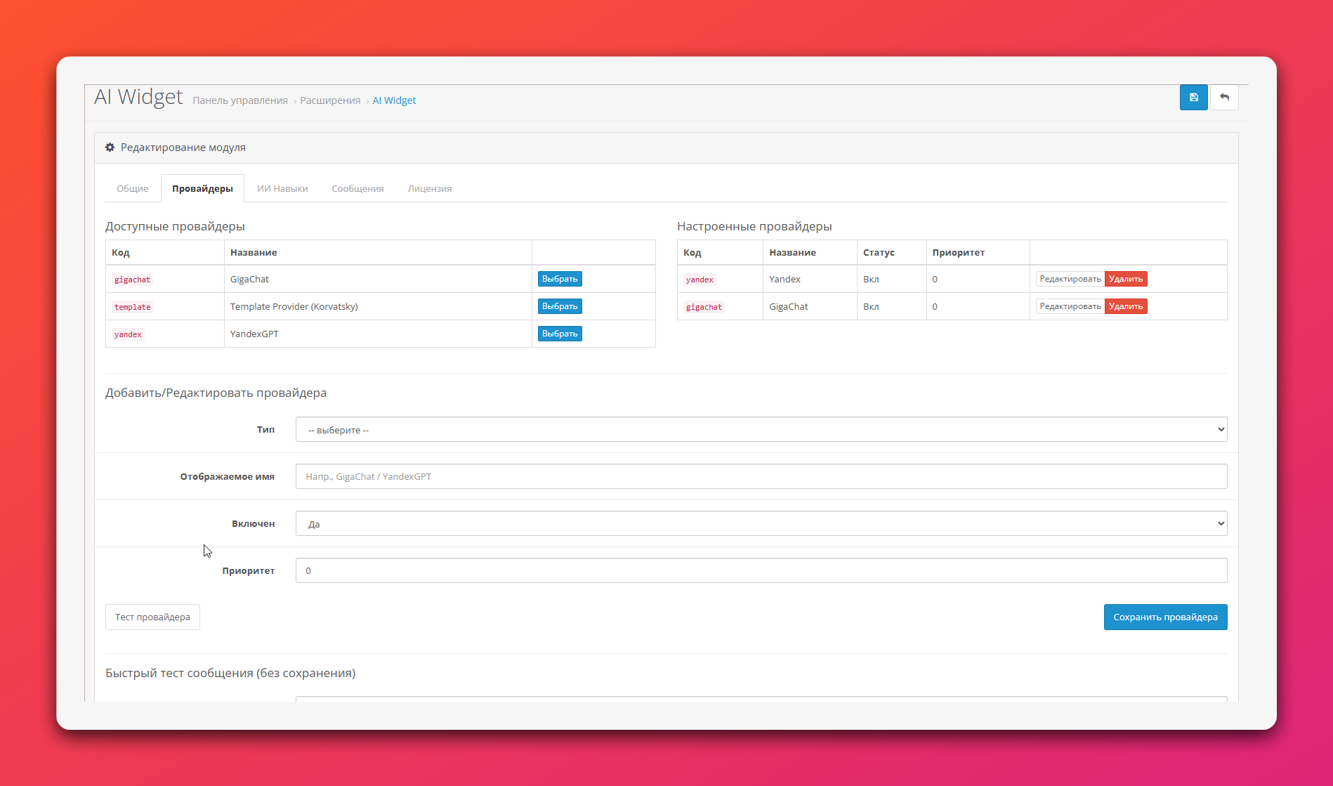 - Настройка ИИ провайдера (ЯндексГПТ, Гигачат, ЧатГПТ и любые другие)