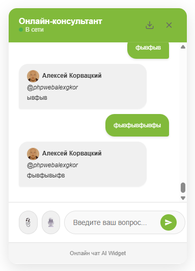 - Хранение в таблицах: aiwidgetkorvatsky_sessions, aiwidgetkorvatsky_messages.