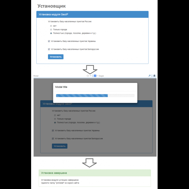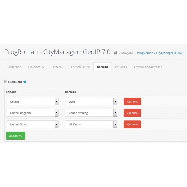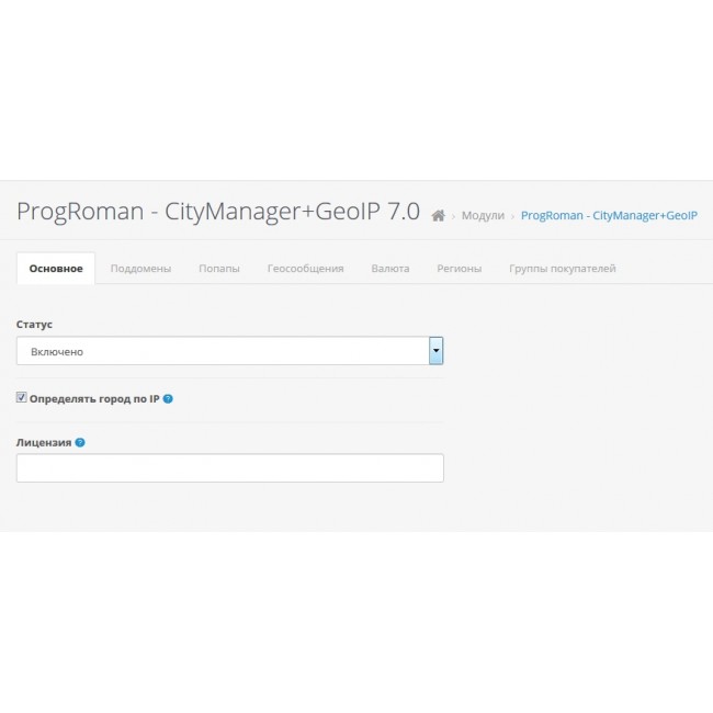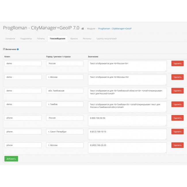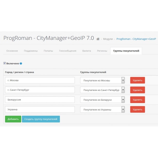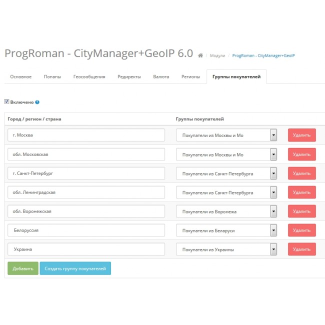 Модуль содержит базу населенных пунктов России (ФИАС), Украины, Белоруссии, Казахстана на русском языке, настройка редиректов, геосообщений и групп покупателей возможна только для этих стран.