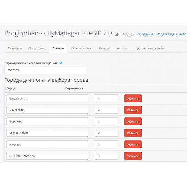 1) Убрать обработку и проверку домена в admin/controller/extension/module/progroman_citymanager.php:371