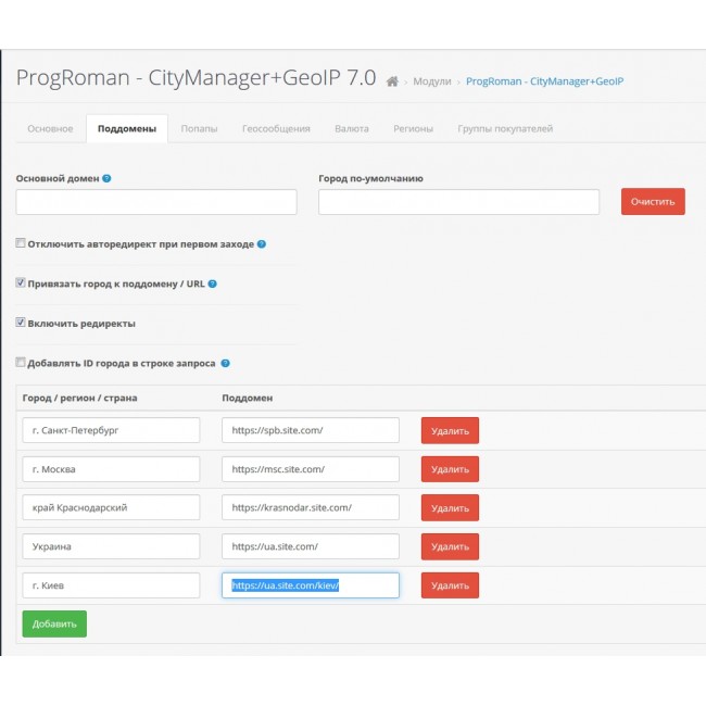 ✓ Привязка городов к поддоменам или подкаталогам, редиректы