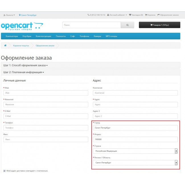 Модуль определяет город по IP-адресу или домену либо пользователь выбирает его вручную, автоматически заполняются поля Страна, Регион, Город, Индекс (если есть в базе) при регистрации и оформлении заказа, избавляя пользователя от ручного ввода.