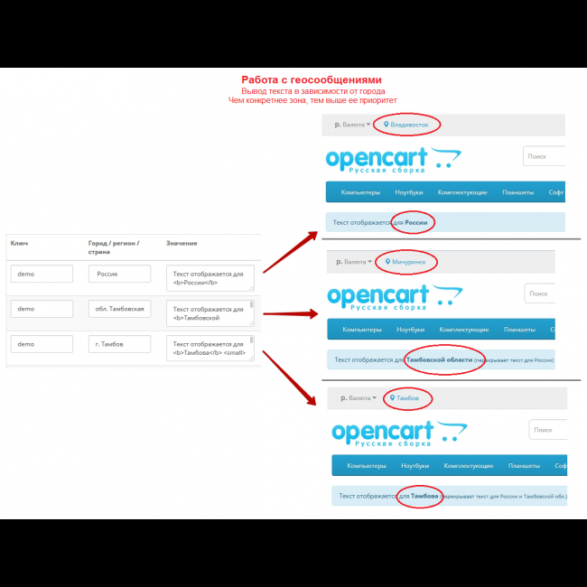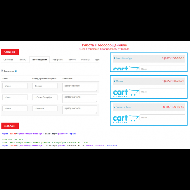 С помощью Геосообщений возможно выводить разный текст или html для городов и регионов.