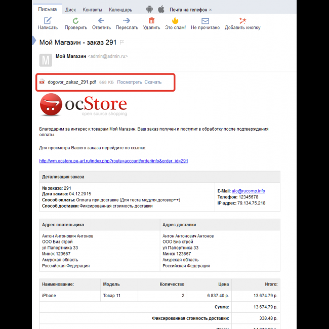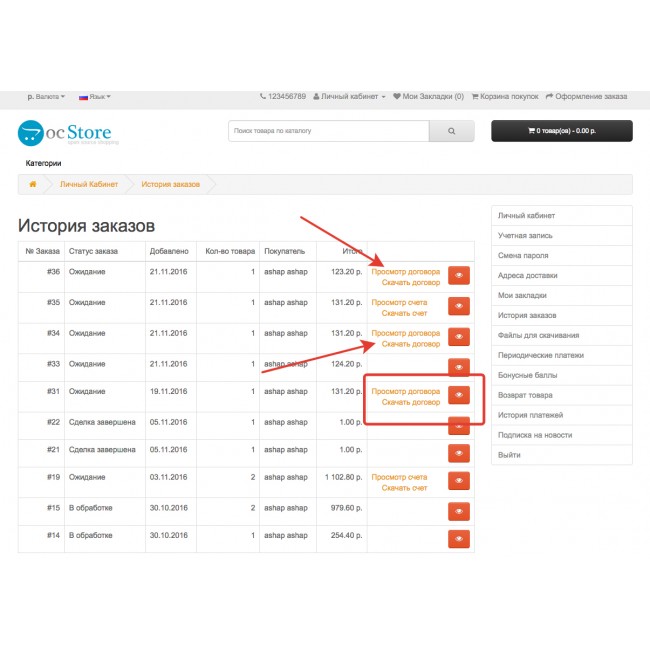 ++ Работает с любым методом оплаты (например) в том числе и поддерживающим автоматическую смену статуса заказа (например) после смены статуса, покупателю отправится письмо с вложением файла pdf(если разрешено в настройках модуля пункт "Прикреплять pdf файл к письму") или текст ссылкой на просмотр договора (добавляется в настройках модуля пункт "Инструкция в письме")