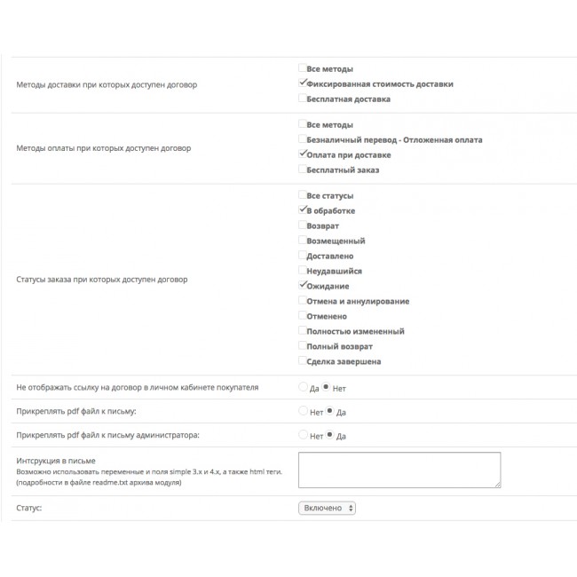 ++ Также возможно настроить модуль для отправки договора непосредственно после оформления заказа, для этого в настройках модуля укажите методы оплаты, и статусы заказа при котором у вас происходит оформление.