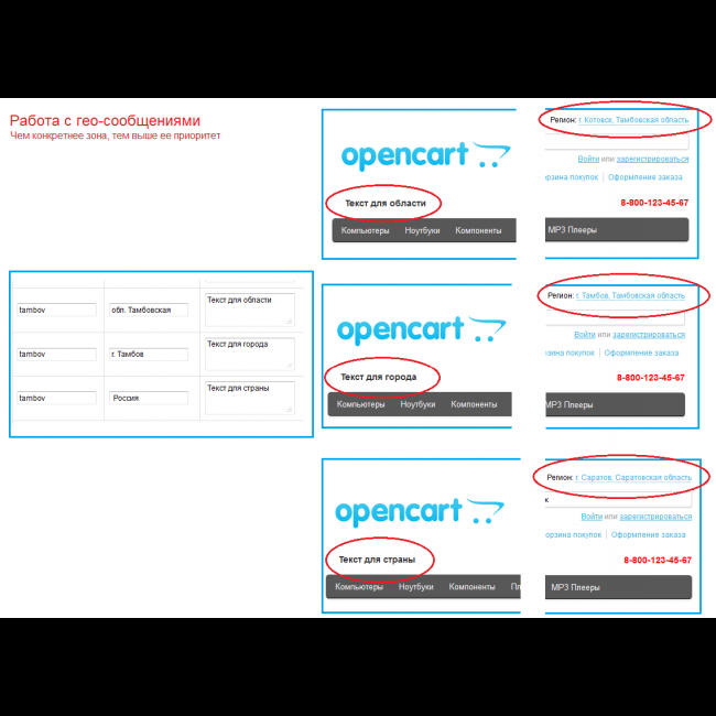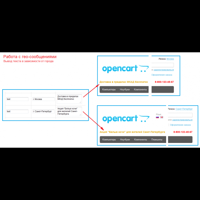 Геосообщения - возможность выводить разный текст или html для городов и регионов (см. скриншоты и FAQ)