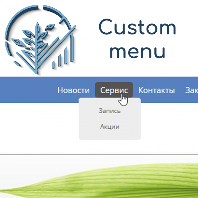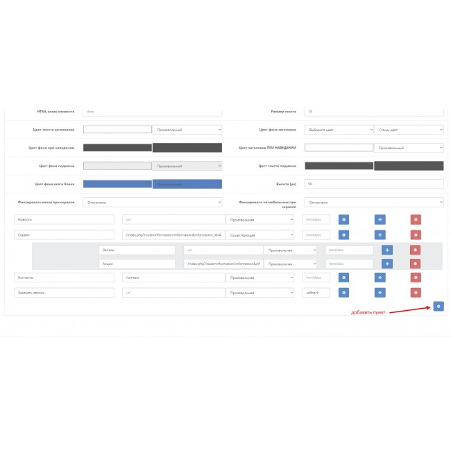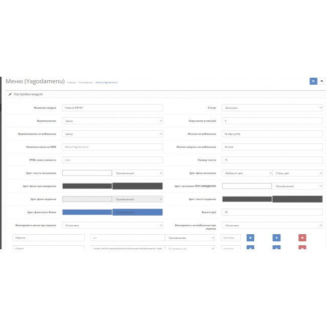 Можно выбрать иконку мобильной версии, цвета фона, текстов, фона подменю и пр.