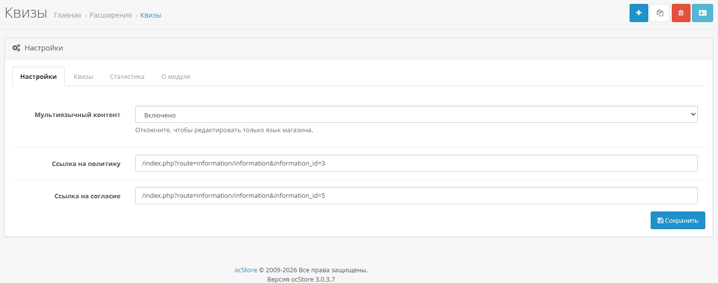 4. Перейдите в раздел «Расширения» → «Модули», найдите «Квизы» и настройте.