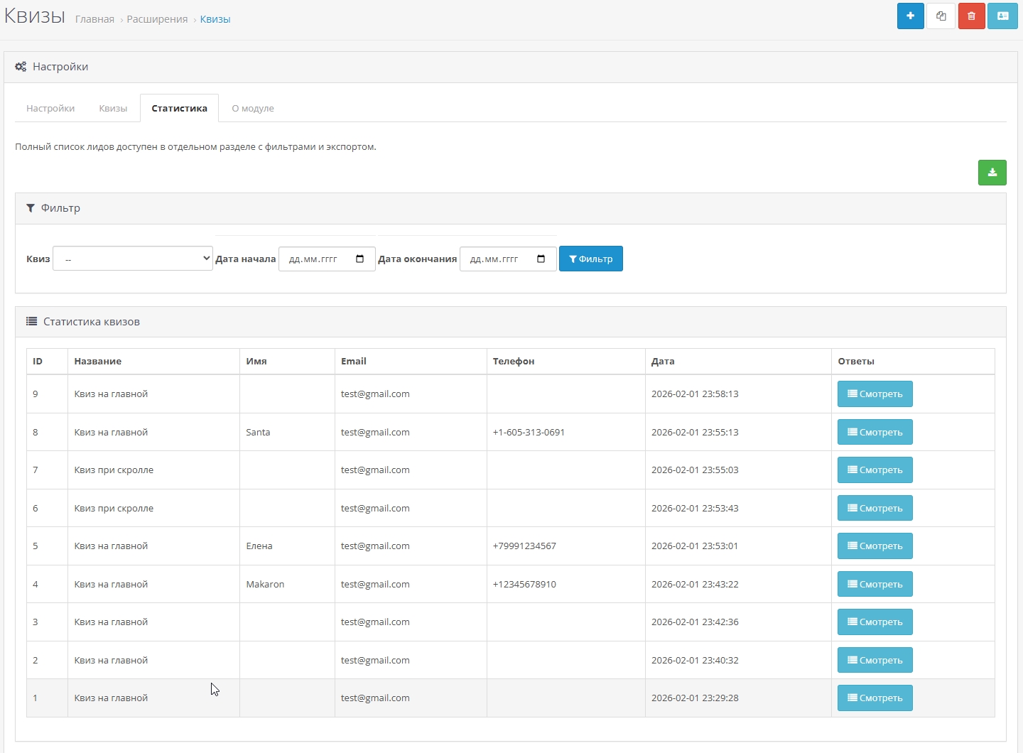 6. Получать подробные отчеты и статистику по каждому квизу: просмотры, конверсия, ответы пользователей и собранные лиды (контакты). Вся информация доступна в удобной таблице с фильтрами.