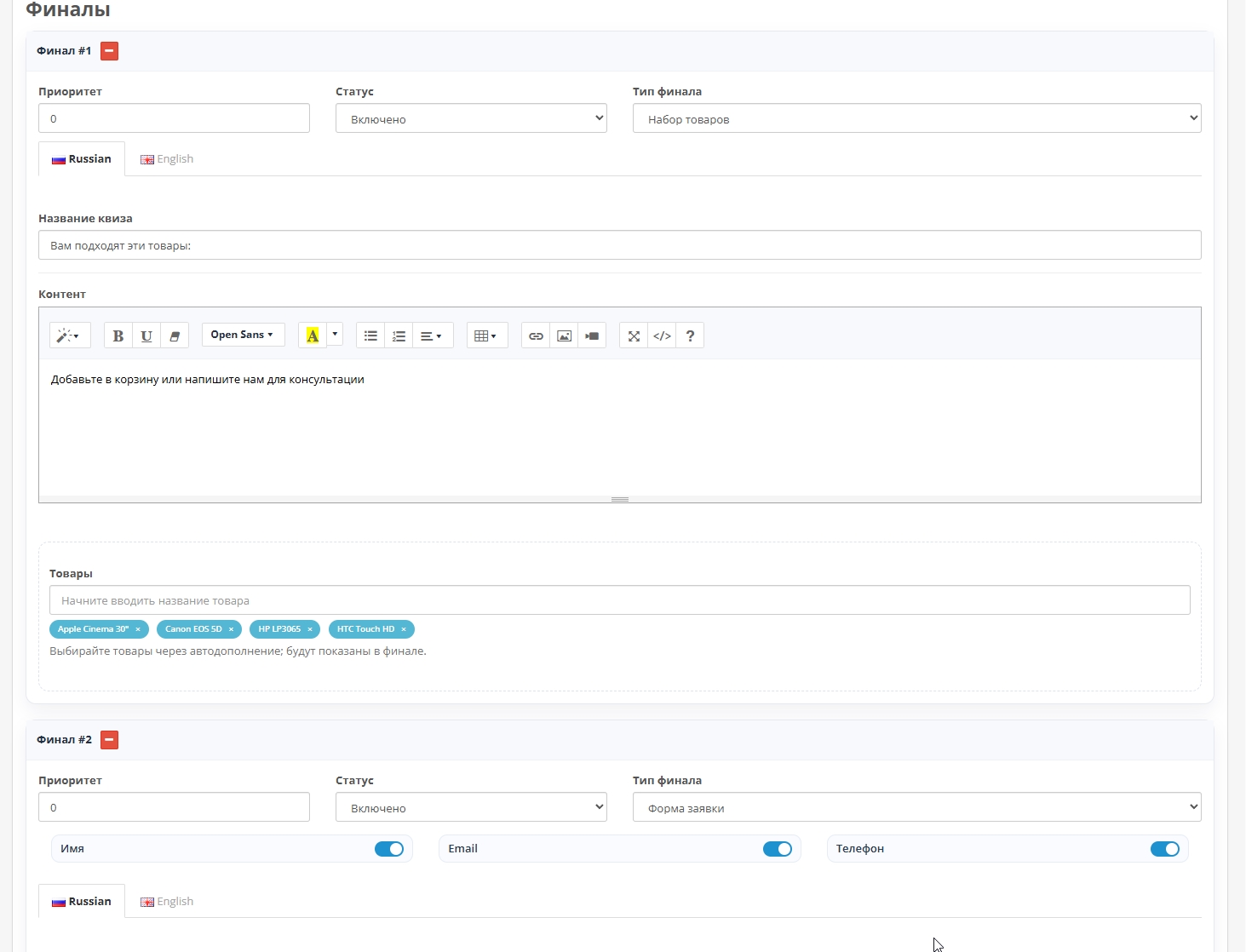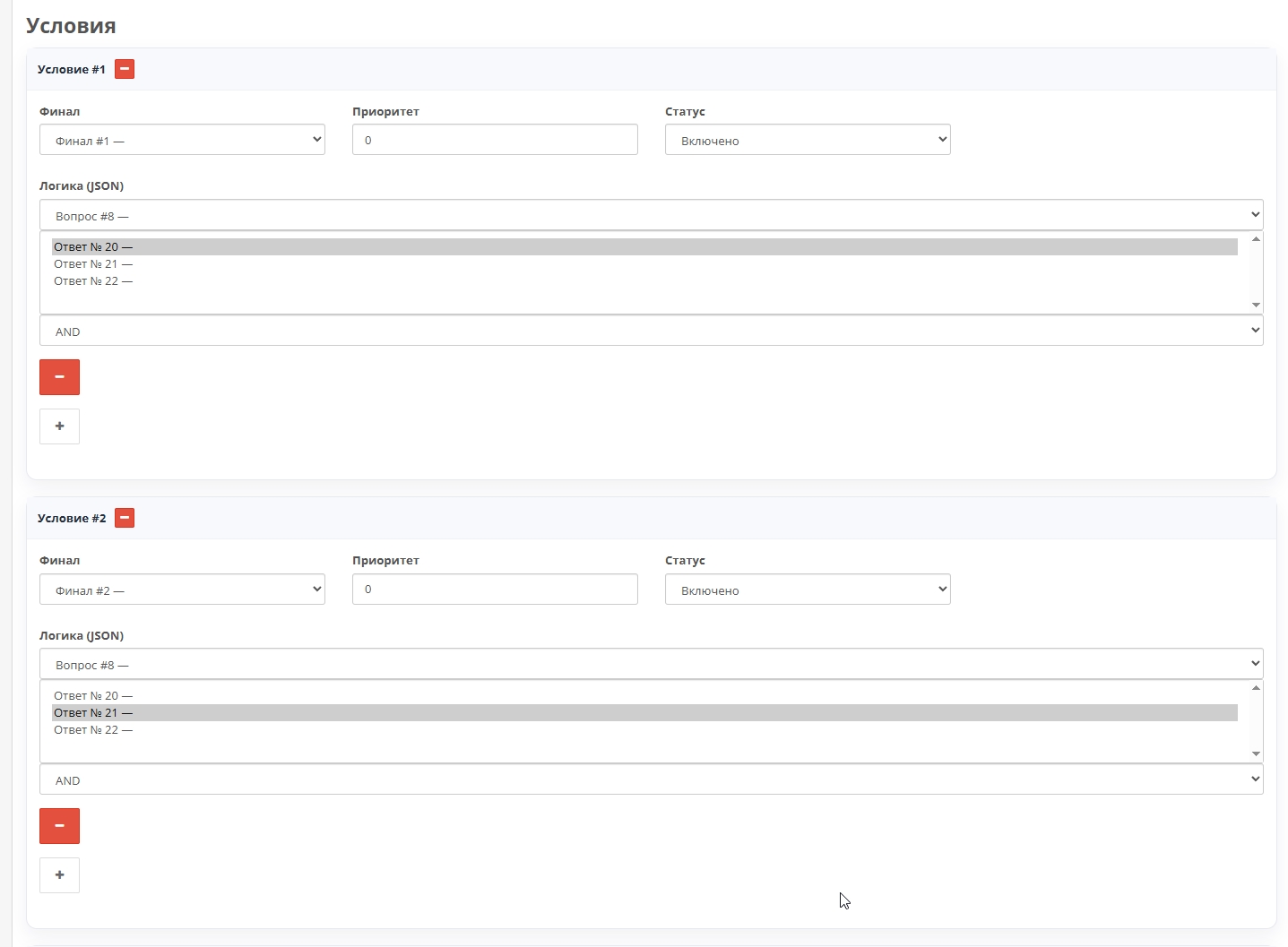 2. Гибко настраивать логику показа финалов с помощью системы условий (JSON). В зависимости от ответов пользователя можно показывать разные наборы товаров или формы заявки.