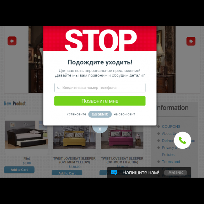 LeadGenic анализирует каждый визит на сайт вашего магазина и исходя из его параметров, а также, поведения пользователя, использует наиболее подходящий для конкретной ситуации виджет с релевантным призывом к действию.