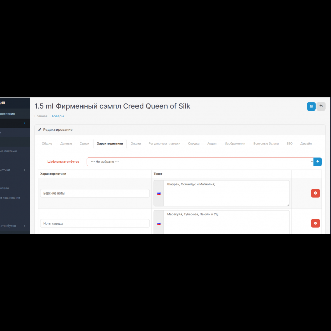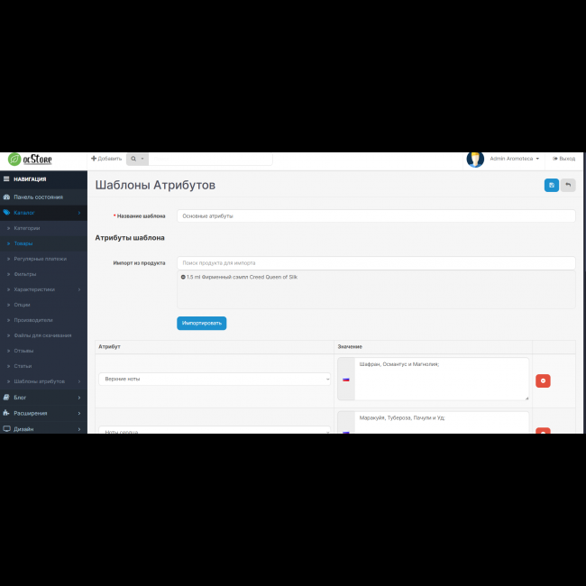 Возможность импортировать атрибуты из существующих товаров для создания шаблонов.
