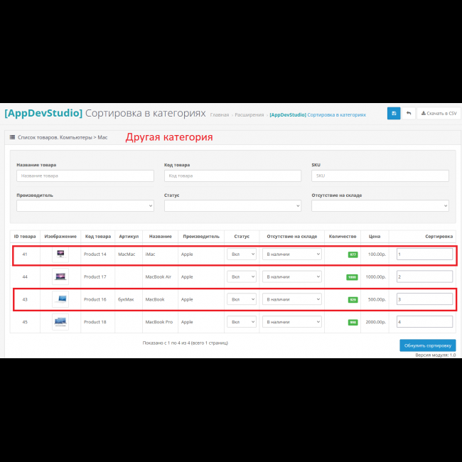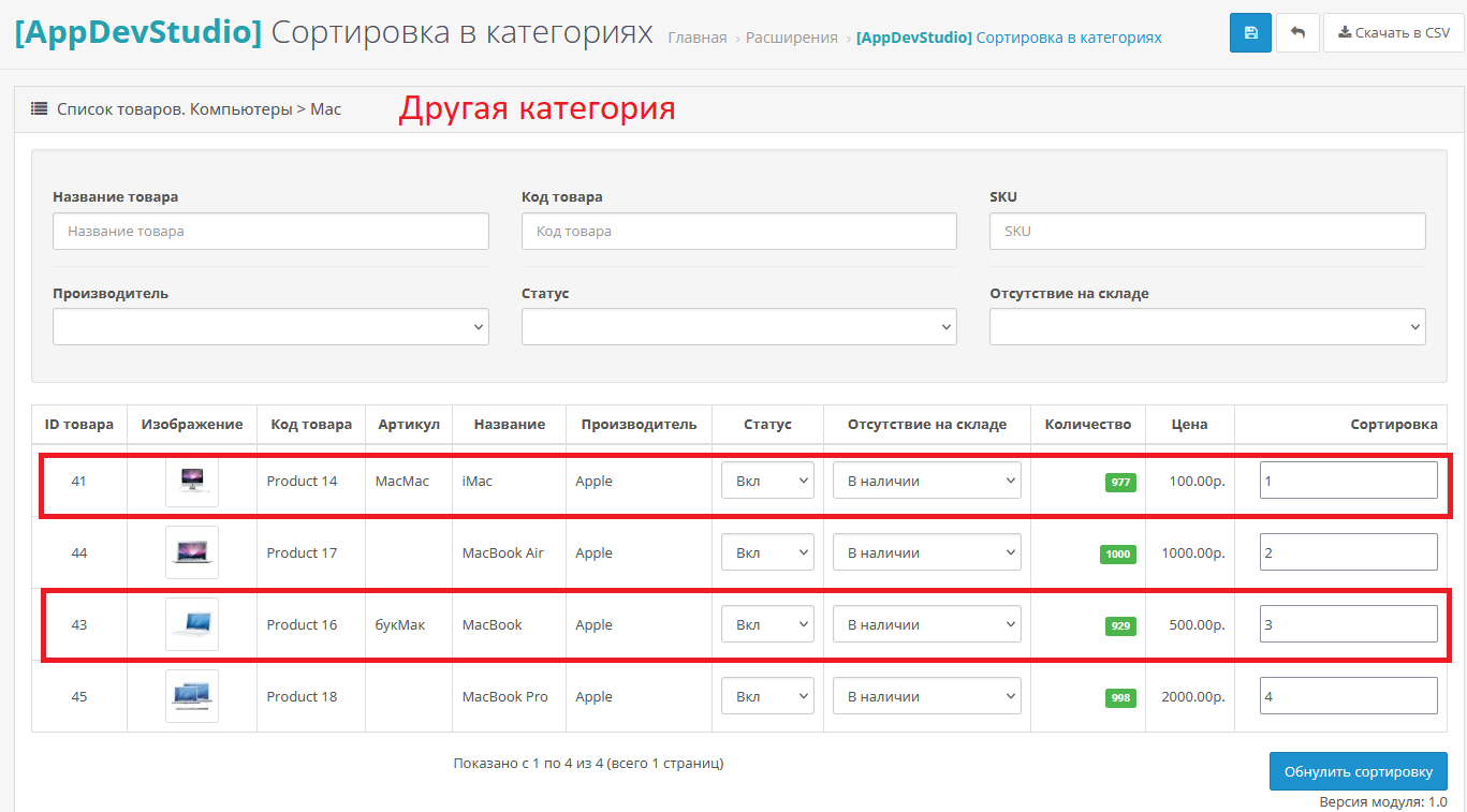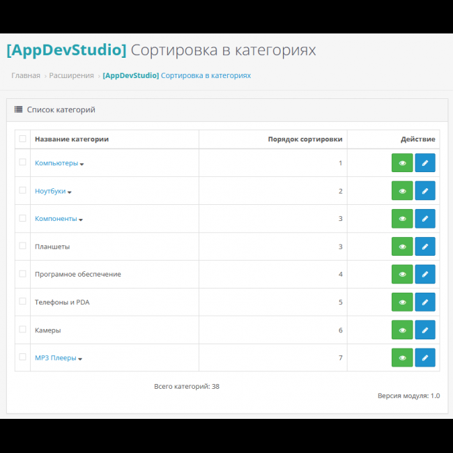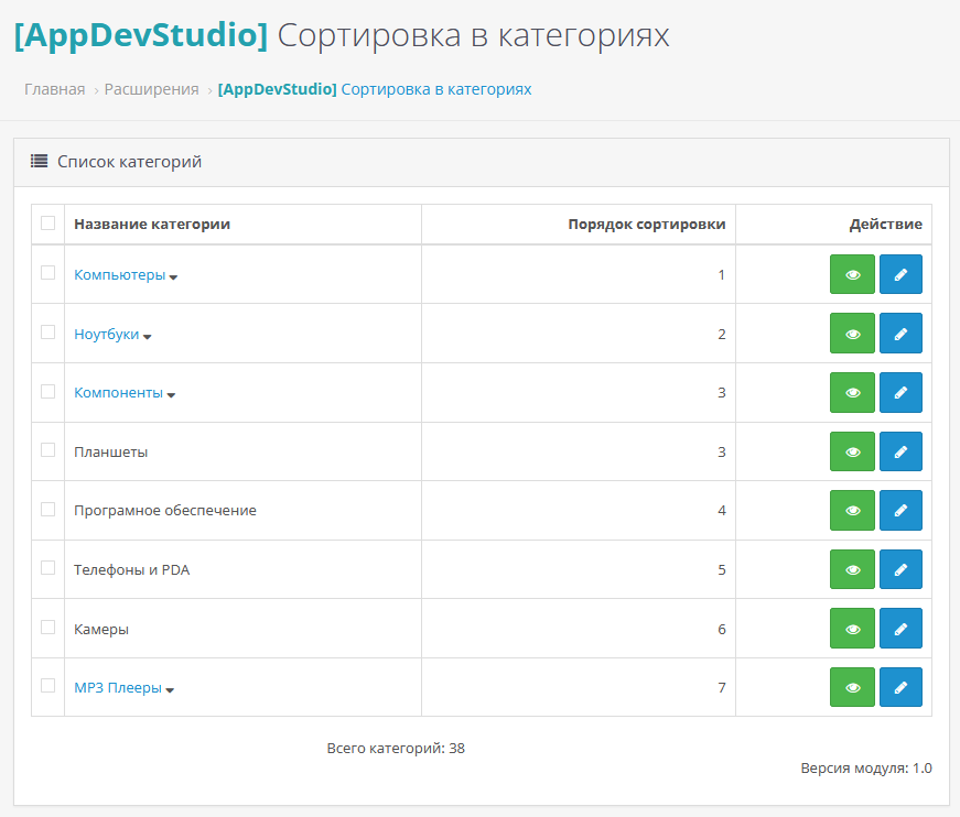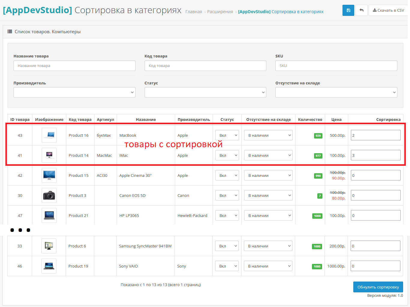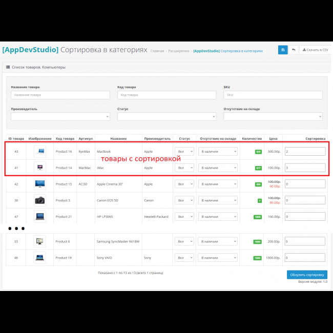 7. Нажмите на кнопку Редактировать напротив [AppDevStudio] Сортировка в категориях и заполняйте сортировку товаров.