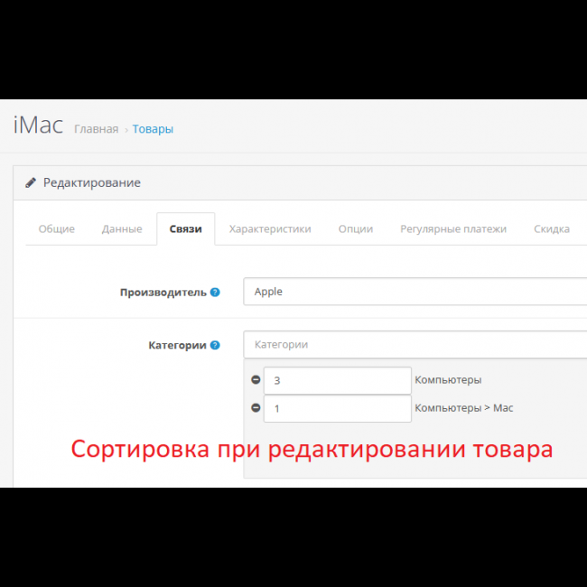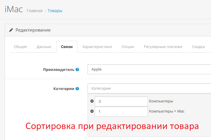 - Указывать сортировку одного товара в разных категориях при его редактировании