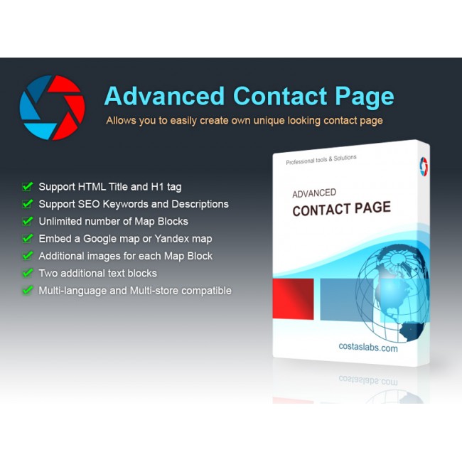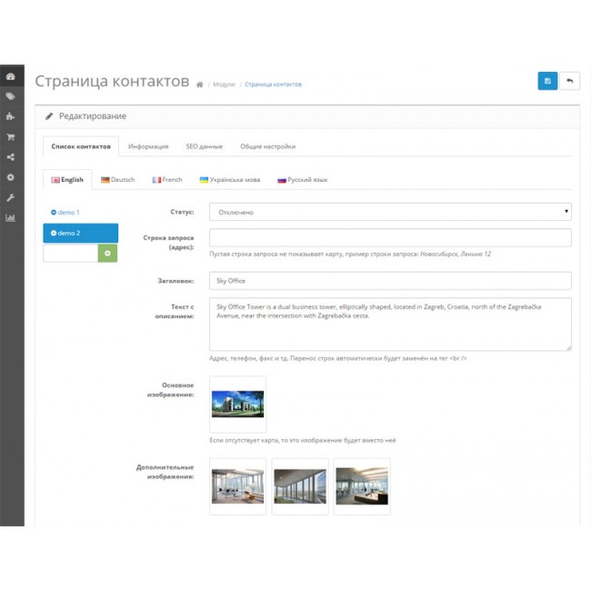 - Два текстовых блока перед и после карт-схем на базе WYSIWYG HTML редактора;