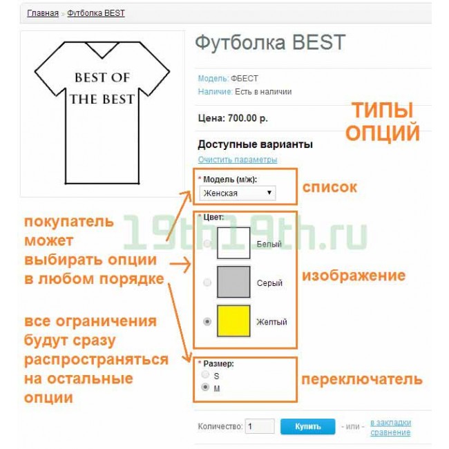 - позволяет задавать различные варианты сочетаний опций для разных товаров (цвет+размер, длина+ширина и т.д.)