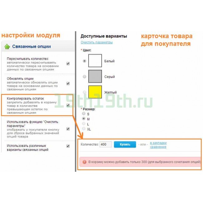 - при заказе товара ограничивает выбор покупателя только доступными сочетаниями опций