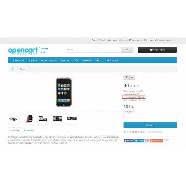 Данное дополнение добавляет в карточку товара информацию о количестве продаж данного товара, если товар еще не был куплен - информация о количестве продаж отображаться не будет.