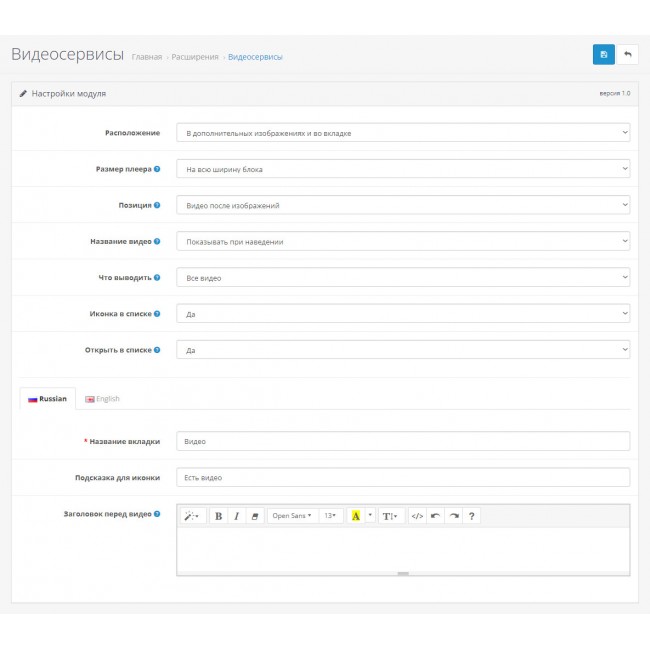 Иногда решающее значение перед покупкой товара в интернет магазине имеет его детальный видео обзор, который снимает долю сомнений покупателя в выборе того или иного товара, тем самым помогая ему быстрее определиться и сделать заказ. Данный модуль поможет вам в этом.