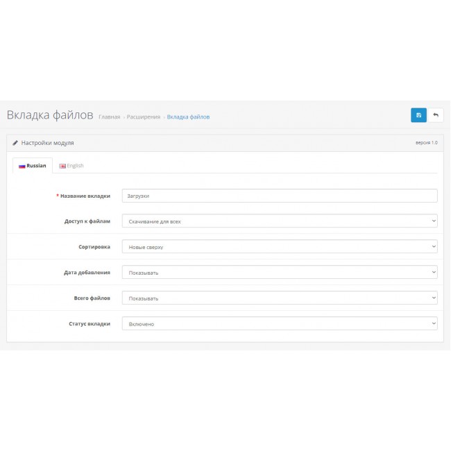 Модуль добавляет вкладку для скачивания файлов на странице товара, а также расширяет функционал стандартного компонента "Файлы для скачивания".