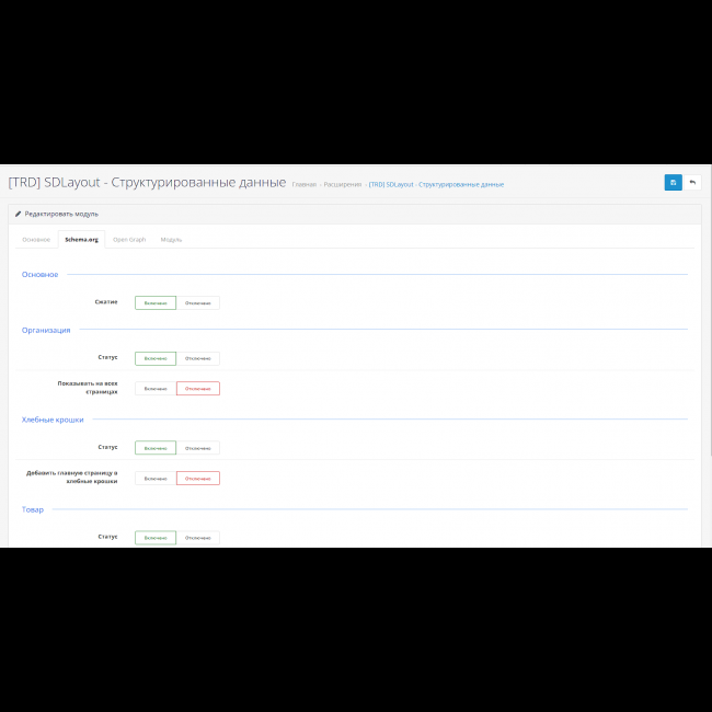Модуль добавляет микроразметку Schema.org в формате JSON-LD и OpenGraph.
