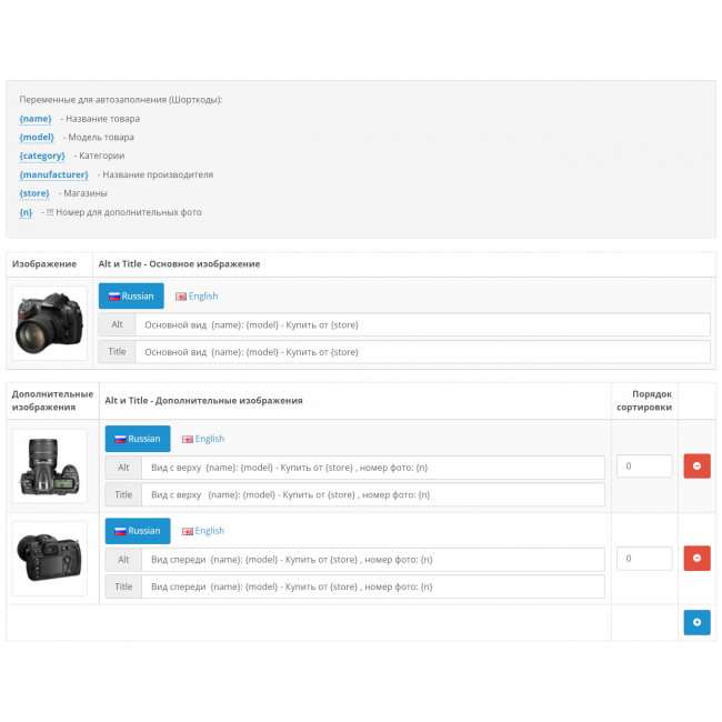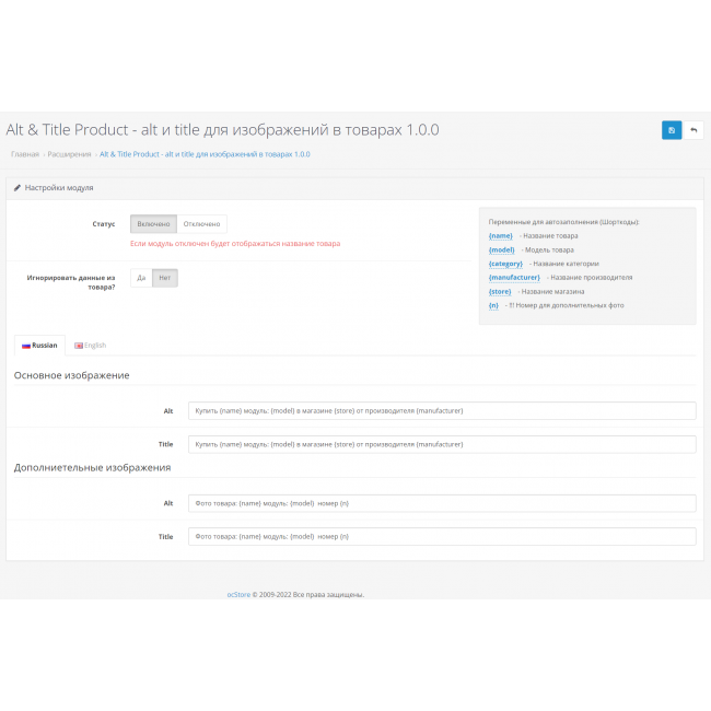 Если выключено и в товаре заполнены атрибуты alt и title - будут в приоритете и не будут перезаписаны