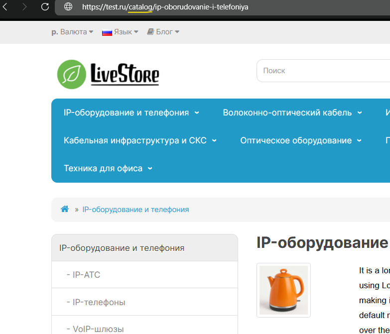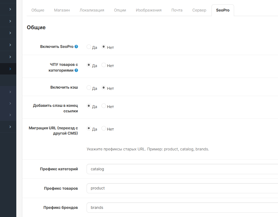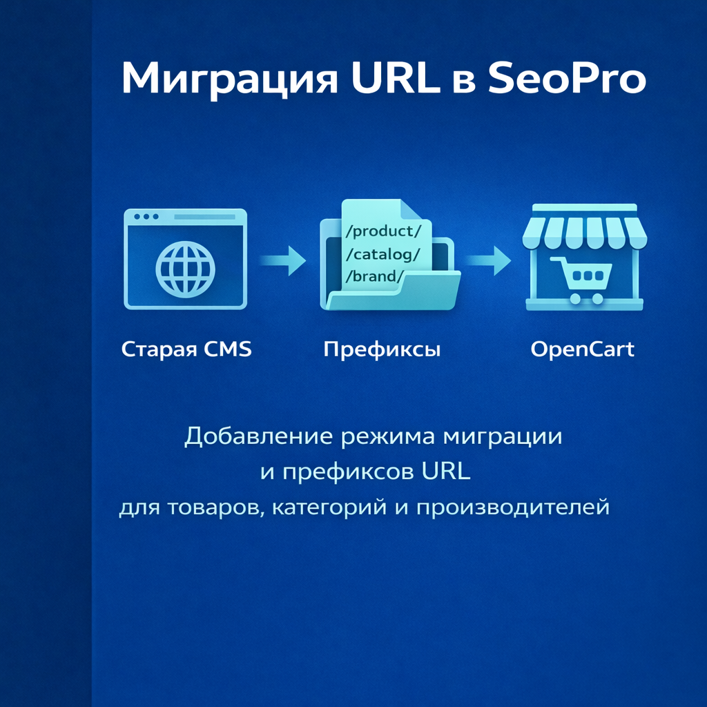 - Позволяет задать кастомные префиксы для товаров, категорий и брендов.
