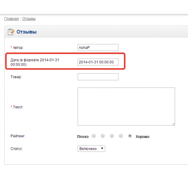 Расширение позволяет редактировать дату отзыва в админ панели (каталог -> отзывы -> изменить)