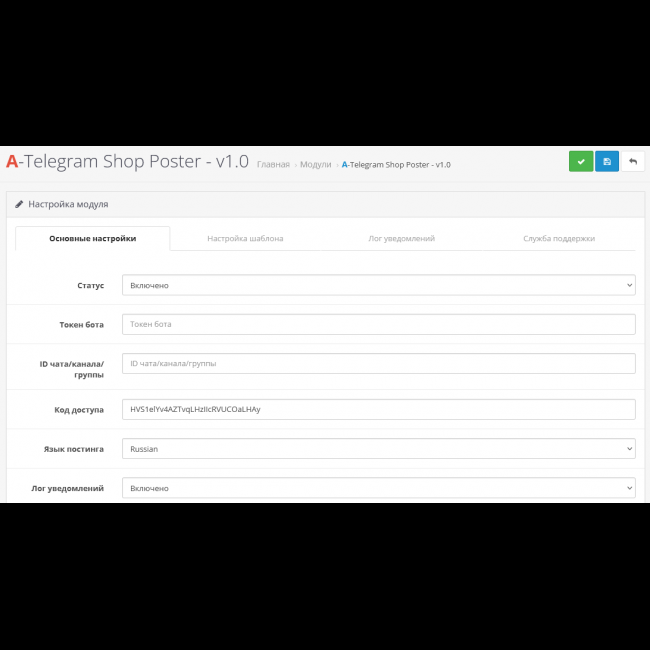 - Установите архив telegram_shop_poster_3.x.ocmod.zip через стандартный менеджер дополнений;