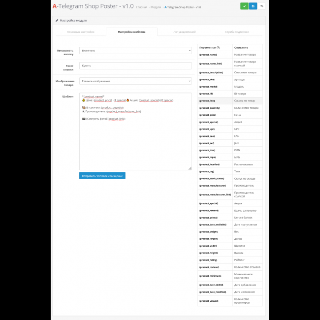 - Настраиваемый шаблон сообщения: можно создать собственный текст с поддержкой переменных {product_name}, {product_price}, {product_special}, {product_quantity}, {product_manufacturer}, {product_description}, {product_name_link} и других базовых полей товара.