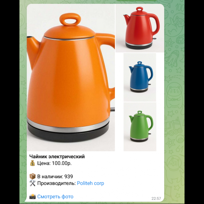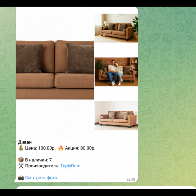 Модуль поддерживает полноценное оформление сообщений: название товара, цена, акция, наличие на складе, производитель, описание, главное изображение, галерею товара и кнопку «Открыть на сайте».