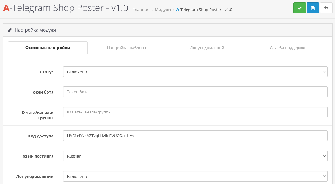- Установите архив telegram_shop_poster_2.x.ocmod.zip через стандартный менеджер дополнений;