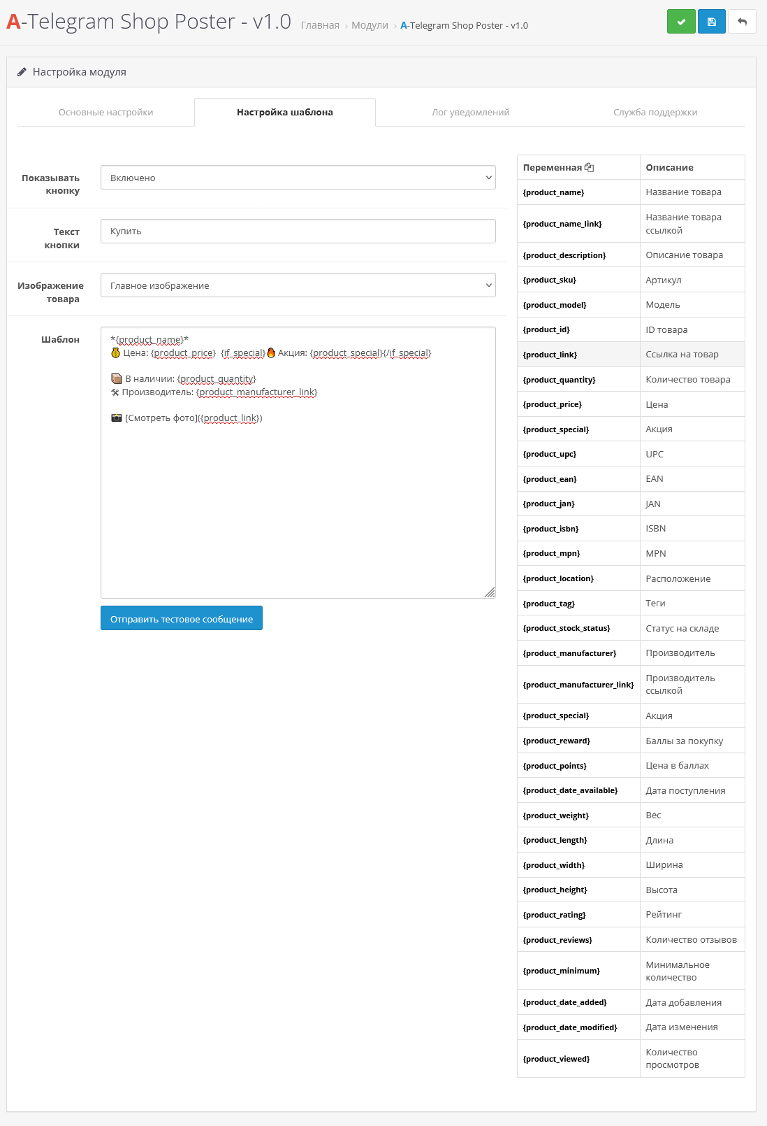- Настраиваемый шаблон сообщения: можно создать собственный текст с поддержкой переменных {product_name}, {product_price}, {product_special}, {product_quantity}, {product_manufacturer}, {product_description}, {product_name_link} и других базовых полей товара.